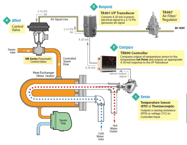 En su versión más básica está constituido por un sensor, un controlador y una válvula de control. Cada elemento trabaja en conjunto con las otras para manejar el sistema. Una vez establecido el set point o punto de ajuste deseado en la variable a controlar, el lazo funciona con un proceso de cuatro pasos.