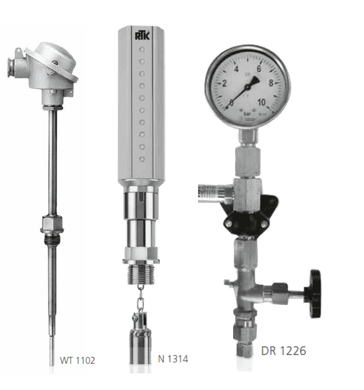 La imagen ilustra sensores de temperatura, presión y nivel.