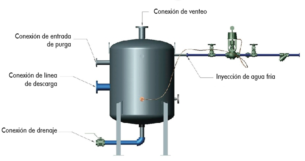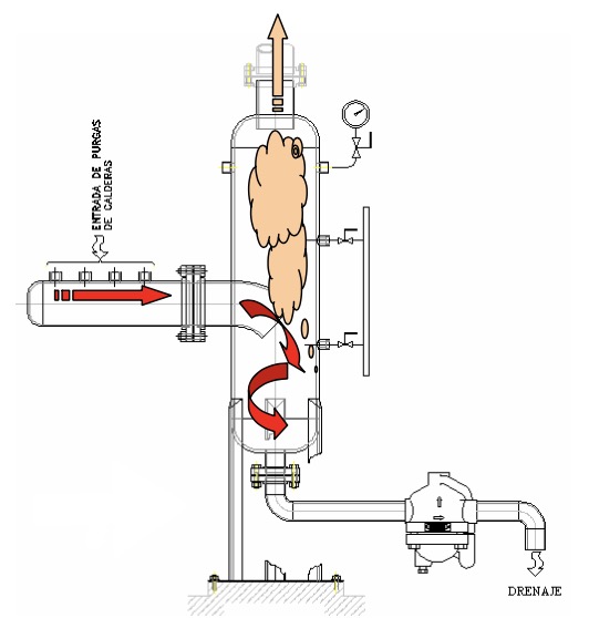 Tradicionalmente la purga de fondo es dirigida hacia un tanque vertical atmosférico de un diámetro muy superior a la tubería de transporte de purga. Esto con el propósito de generar un cambio de presión en el fluido, lo cual conllevara a un re-vaporizado instantáneo conocido como vapor flash y permite un enfriamiento del agua no re-vaporizada