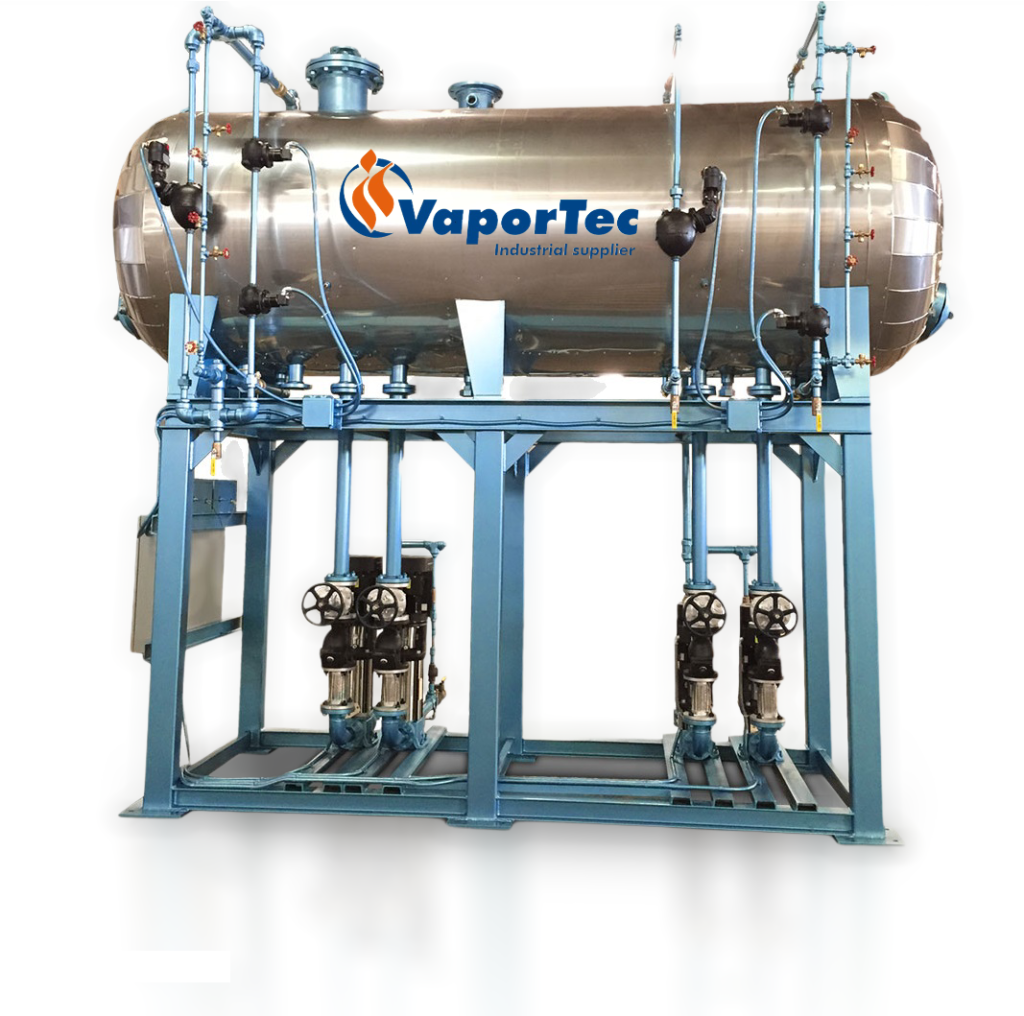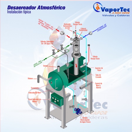 La desaireación mecánica se realiza en equipos denominados desaireadores, que eliminan el oxígeno mediante calentamiento y reducción de presión. El agua se pulveriza dentro del desaireador, aumentando su superficie de contacto y facilitando la liberación de gases. Este método es eficiente para grandes volúmenes, aunque puede requerir ajustes según la variabilidad de la carga térmica. Ver nuestros desaireadores.