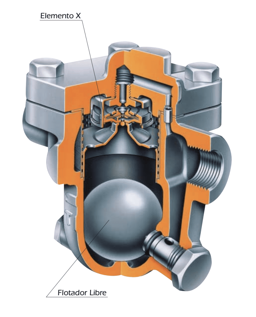 Una trampa de flotador libre funciona mediante un mecanismo de flotador esférico (generalmente de acero inoxidable) que sube o baja según el nivel de condensado dentro de la trampa. Este movimiento acciona directamente una válvula de descarga, permitiendo que el condensado salga de manera continua sin dejar escapar vapor. Internamente conformado por un flotador esférico sellado ofreciendo una descarga continua de condensado, además de tener un venteo de aire automático, estas pueden ser instaladas en procesos que requieran descargas de condensado muy altas, drenajes continuos y venteo de aire. Su aplicación puede estar dirigida a sistemas de absorción, serpentines, intercambiadores de calor, secadores, evaporadores, generadores de agua caliente, equipo de proceso alimentados con vapor, unidades calentadoras y marmitas de cocción.